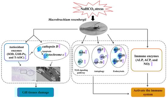 The gill tissue damage and the potential molecular response mechanisms in the gills of M. rosenbergii under NaHCO3 stress.