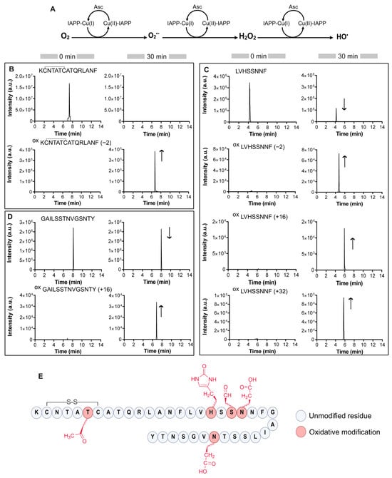 Identification of site-specific IAPP oxidation. (A) Generation of ROS catalyzed by copper in the presence of IAPP peptide. Asc refers to ascorbate. (B–D) Extracted ion chromatograms of chymotryptic IAPP: (B) 1KCNTATCATQRLANF15, (C) 16LVHSSNNF23 and (D) 24GAILSSTNVGSNTY37 prior and after 30 min oxidation reaction. The direction of the arrows reflects changes in chromatographic peak intensities. (E) Summary of Cu-mediated oxidative modifications on IAPP. Oxidative sites identified by MS/MS analysis are highlighted in red.