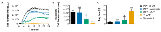 Assessment of IAPP amyloid self-assembly in the presence or absence of Cu(II) and ascorbic acid. (A) Kinetics of IAPP amyloid formation at 25 µM monitored by ThT. (B) ThT fluorescence intensity at endpoint. (C) Lag time determined from sigmoidal fit. (B,C). Data were collected from at least four independent experiments performed in triplicates. p < 0.05 (*); p < 0.0005 (***); p < 0.0001 (****); ns: non-significant.