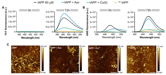 Analysis of the effect of oxidation on IAPP assemblies. (A–C) IAPP was incubated at 60 µM at room temperature for 72 h in the presence of Cu(II) (50 µM) and/or ascorbic acid (500 µM). The mixture was analyzed by: (A) ThT fluorescence with excitation at 440 nm, (B) ANS fluorescence with excitation at 355 nm, and (C) AFM: Scale bar is 2 µm and each image is 10 μm × 10 μm.