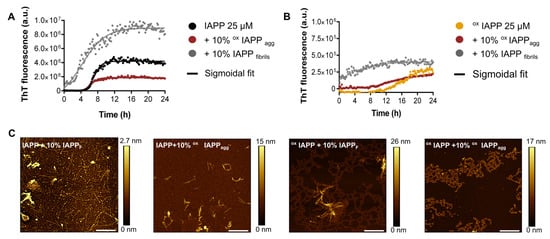 Evaluation of the seeding capacity of oxidized IAPP aggregates. (A) Aggregation kinetics of 25 µM IAPP in the presence, or absence, of 10% preformed IAPP fibrils or oxidized IAPP aggregates. (B) Aggregation kinetics of 25 µM oxidized IAPP in the presence or absence of 10% preformed IAPP fibrils or oxidized IAPP aggregates. (A,B) Peptides were incubated at 25 µM in 50 mM phosphate buffer, pH 7.4, with or without seeds, and ThT fluorescence was measured using an excitation wavelength of 440 nm. Curves were fitted using a sigmoidal growth model. (C) AFM imaging after 72 h of incubation. Scale bar is 2 µm and each image is 10 μm × 10 μm.