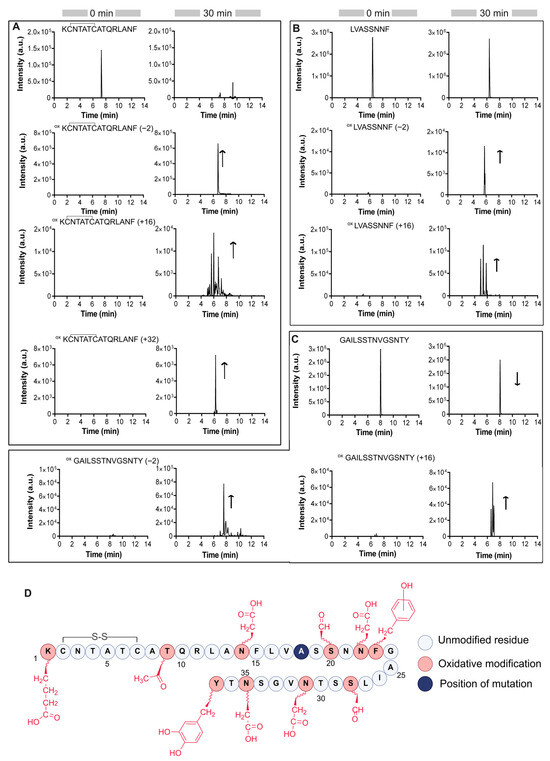 High-resolution extracted ion chromatograms were acquired with a mass accuracy of ±5 ppm. Representative MS/MS spectra are provided in the Supplementary Information (Figure S1), and a summary of the detected residue modifications is shown in Figure 1E.