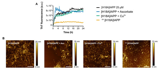 (A) Self-assembly of [H18A]IAPP (25 µM) monitored by ThT fluorescence in the presence of copper (25 µM), and/or ascorbate (250 µM), in phosphate buffer (pH 7.4). (B) AFM images of [H18A]IAPP (60 µM) in the presence, or absence, of copper and ascorbate, after pre-incubation under quiescent conditions for 72 h prior to analysis. Scale bar is 2 µm and each image is 10 μm × 10 μm.