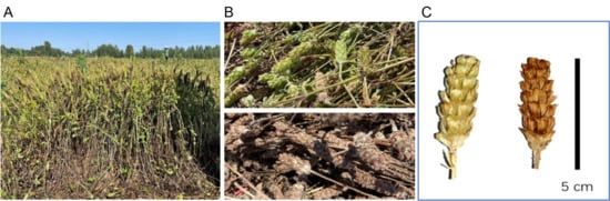 (A) The plants of Prunella vulgaris L. (PV); (B) manually sorted fruit-spikes of PV; (C) a close-up photograph of green and red-brown fruit-spikes.