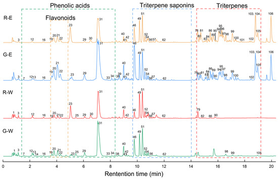 To clarify the components contributing to the significant difference in total extract yields of the two fruit-spikes, we first comprehensively identified all components, followed by differential analysis. A total of 106 components were identified in the water and 75% ethanol extracts of both green and red-brown spikes by UPLC-MS/MS. Compound identification relied on retention times, UV spectra, quasi-molecular ions, and adduct ion peaks from MS and characteristic MS/MS fragment ions. These components were segregated into distinct classes by retention time: phenolic acids (0.5–8.3 min), flavonoids (3.6–5.2 min), triterpene saponins (8.4–14.3 min), and triterpenes (14.5–20.0). Identification was validated against reference data, online databases such as PubChem, ChemSpider, and SciFinder, and our previous report [15]. Typical total-ion chromatograms of green and red-brown fruit-spikes are shown in Figure 2, and the full list of identified components is provided in Table 1.