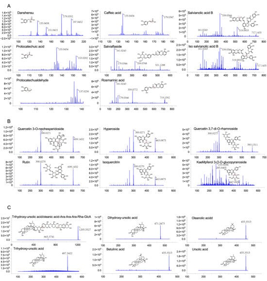 The mass spectra and structures of (A) rosmarinic acid, salviaflaside, protocatechuic acid, protocatechualdehyde, caffeic acid, danshensu, salvianolic acid B, and isosalvianolic acid B; (B) quercetin 3-O-neohesperido-side, rutin, hyperoside, isoquercitrin, quercetin 3,7-di-O-rhamnoside, and kaempferol 3-O-D-glucoside; (C) typical triterpenoid saponin, dihydroxy triterpene, trihydroxy triterpene, betulinic acid, oleanolic acid, and ursolic acid.