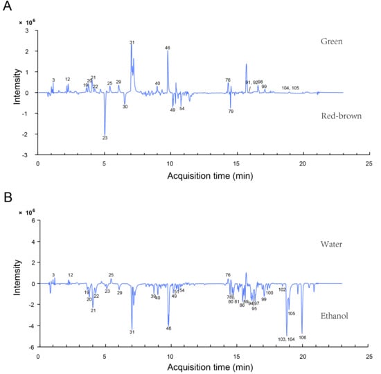 Differences between green and red-brown fruit-spike samples and between extraction solvents. (A) Subtraction of the base peak intensities of the water extracts of a green (above) and a red-brown (below) sample; (B) subtraction of the base peak intensities of the green sample extracted using water (above) and 75% ethanol (below). The serial numbers presented in the figure align with the serial numbers of the compounds listed in Table 1.