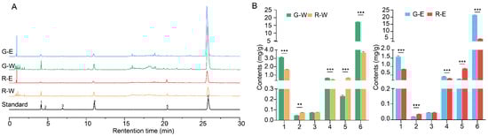 (A) Typical UPLC chromatograms of G-E, G-W, R-E, and R-W samples and mixture standards; (B) the content of six phenolic acids in samples of G-W, R-W, G-E, and R-E. G, green fruit-spikes; R, red-brown fruit-spikes; W, water extract; E, 75% ethanol extract. 1, danshensu; 2, protocatechuic acid; 3, protocatechualdehyde; 4, caffeic acid; 5, salviaflaside; 6, rosmarinic acid; ** and *** indicate a significant difference according to Dunnett’s T3 multiple-comparison test for protocatechuic acid contents or Tukey’s post hoc test for others, corresponding to p ≤ 0.01 and p ≤ 0.001.