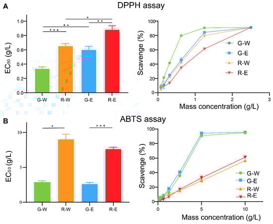 The EC50 value and the scavenge of DPPH (A) and ABTS (B) with G-W, R-W, G-E, and R-E samples. G, green fruit-spikes; R, red-brown fruit-spikes; W, water extract; E, 75% ethanol extract. *, ** and *** indicates a significant difference according to the Dunnett’s T3 multiple comparison test corresponding to p ≤ 0.05, p ≤ 0.01 and p ≤ 0.001, respectively.