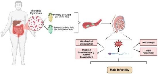 - Baptissart, M.; Vega, A.; Martinot, E.; Pommier, A.J.; Houten, S.M.; Marceau, G.; de Haze, A.; Baron, S.; Schoonjans, K.; Lobaccaro, J.M.; et al. Bile acids alter male fertility through G-protein-coupled bile acid receptor 1 signaling pathways in mice. Hepatology 2014, 60, 1054–1065. [Google Scholar] [CrossRef]