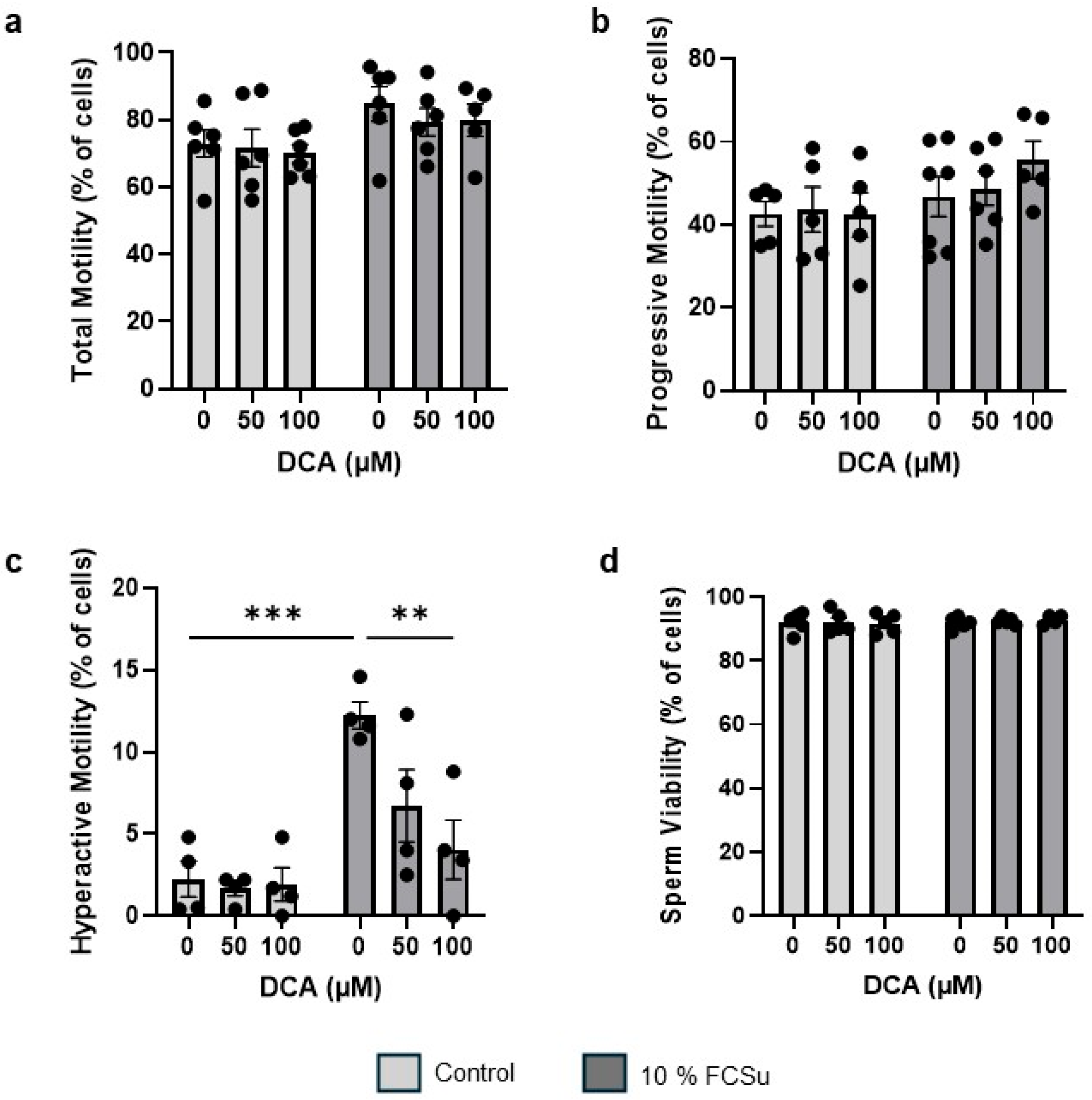 3.2. DCA Treatment Does Not Affect Sperm Total and Progressive Motility and Viability, Yet Impairs Hyperactive Motility
