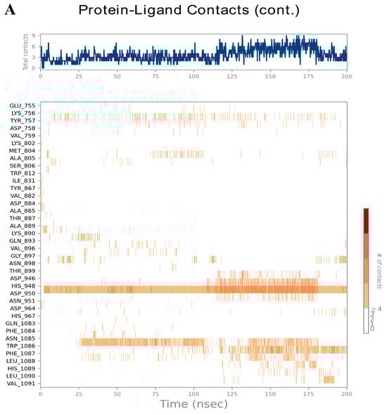 The contact timelines in Figure 9A,B illustrate residue–ligand interactions across the 200 ns simulation. Darker orange shades indicate residues forming multiple simultaneous contacts. Tiliacorinine engaged MTOR residues ASP950, TRP1086, and PHE1087 (Figure 9A), while the MTOR–GDC-0980 complex showed stable interactions at ASP950, ASP964, TRP1086, and PHE1087 (Figure 9B), reflecting consistent binding throughout the trajectory. Histograms in Figure 10A,B depict intermolecular interactions at MTOR’s active site, including hydrogen bonding, hydrophobic contacts, ionic interactions, and water bridges. In the MTOR-tiliacorinine complex (Figure 10A), hydrogen bonds were formed at ASP950 and TRP1086, while PHE1087 and ASP948 participated in hydrophobic and water-mediated interactions. The MTOR-GDC-0980 complex (Figure 10B) showed key contacts at ASP964, ASP950, and ASN951, with ionic interactions involving GLU755 and ASP950. These MD simulation results align well with docking predictions, reinforcing tiliacorinine’s stable and specific binding at the MTOR active site.