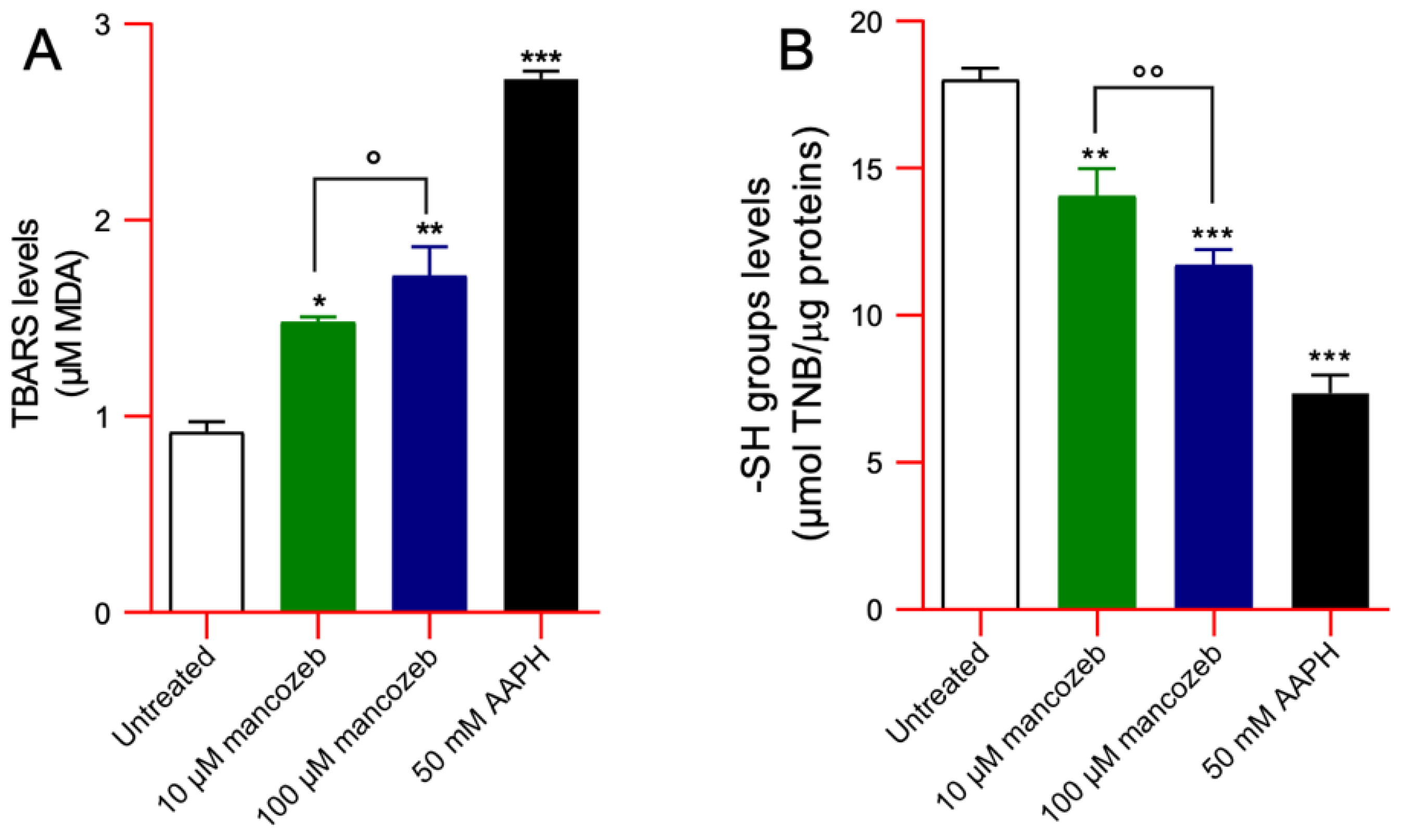 | 100 µM mancozeb | 0.043 ± 0.005 | 23.06 ± 1.91 *,° | 270 ± 7.15 *** | 10 |