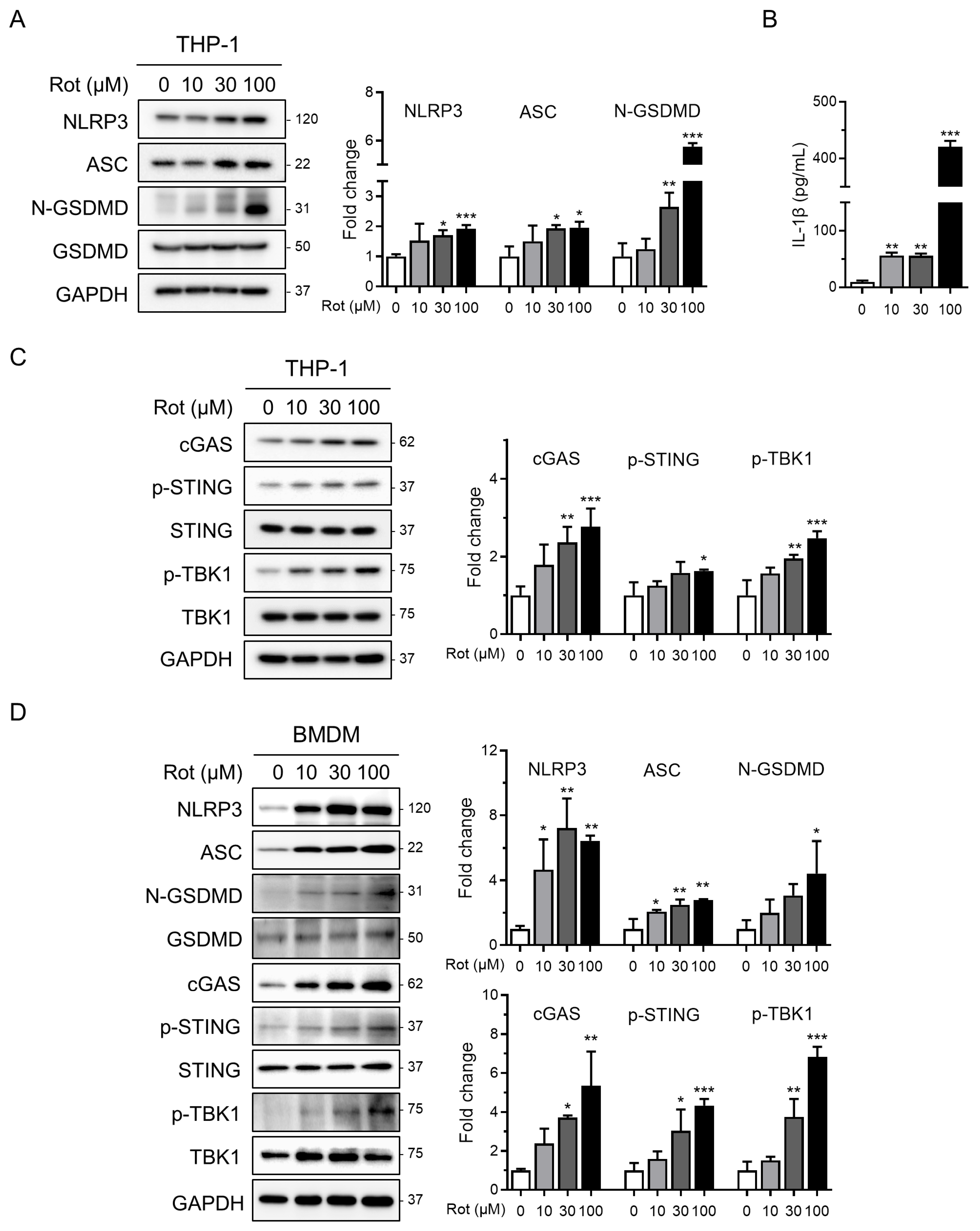 3.1. Rotenone Activates the NLRP3 Inflammasome Through the cGAS–STING Pathway in THP-1-Derived Macrophages
