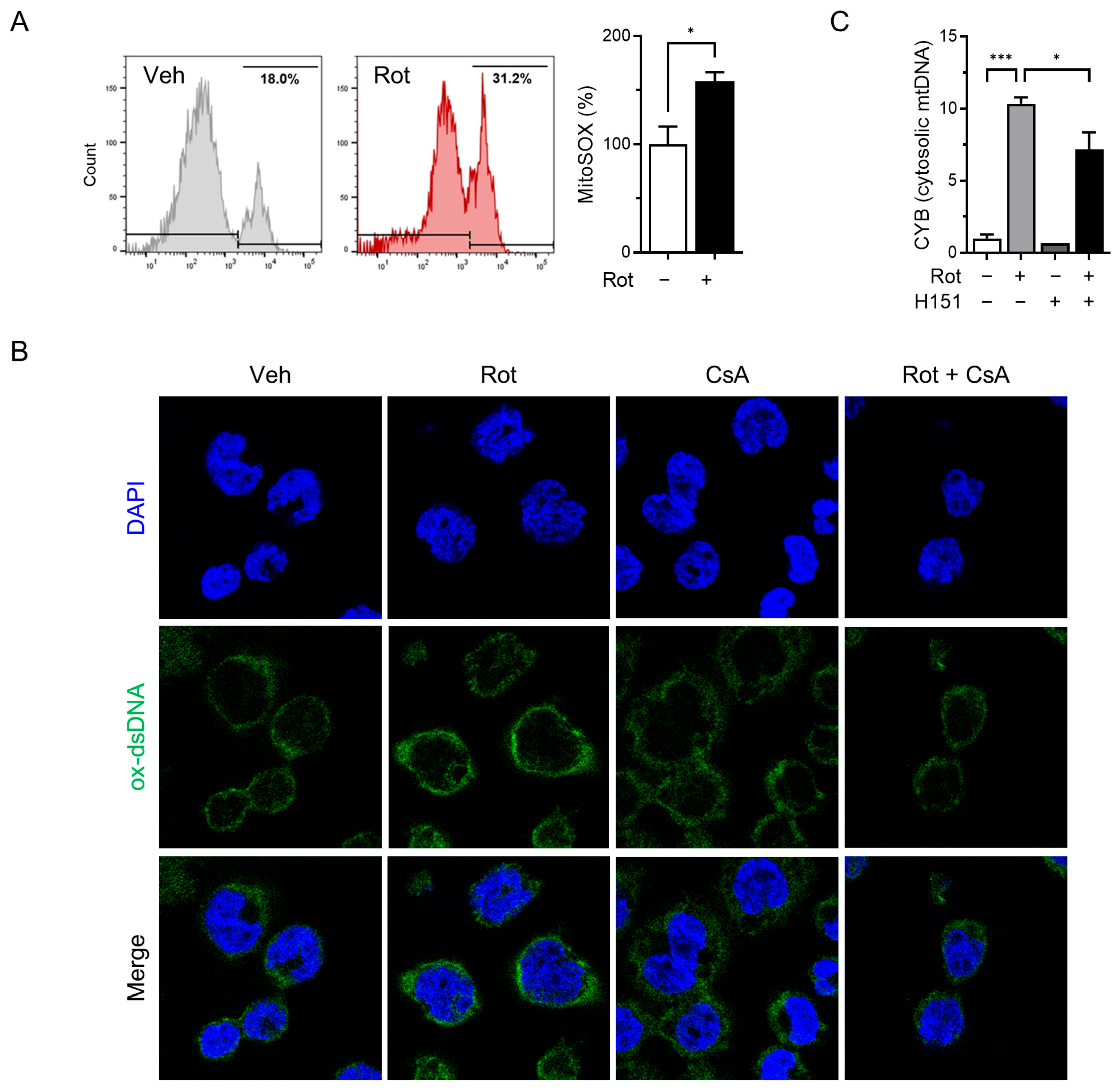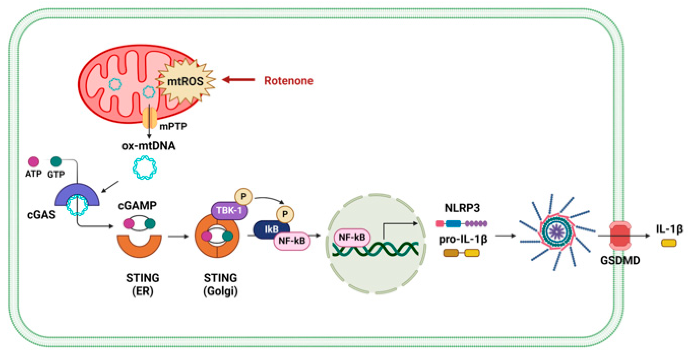 APA StyleMun, Y., Kim, J., Choi, Y.-J., & Lee, B.-H. (2025). cGAS–STING–NF-κB Axis Mediates Rotenone-Induced NLRP3 Inflammasome Activation Through Mitochondrial DNA Release. Antioxidants, 14(11), 1276. https://doi.org/10.3390/antiox14111276