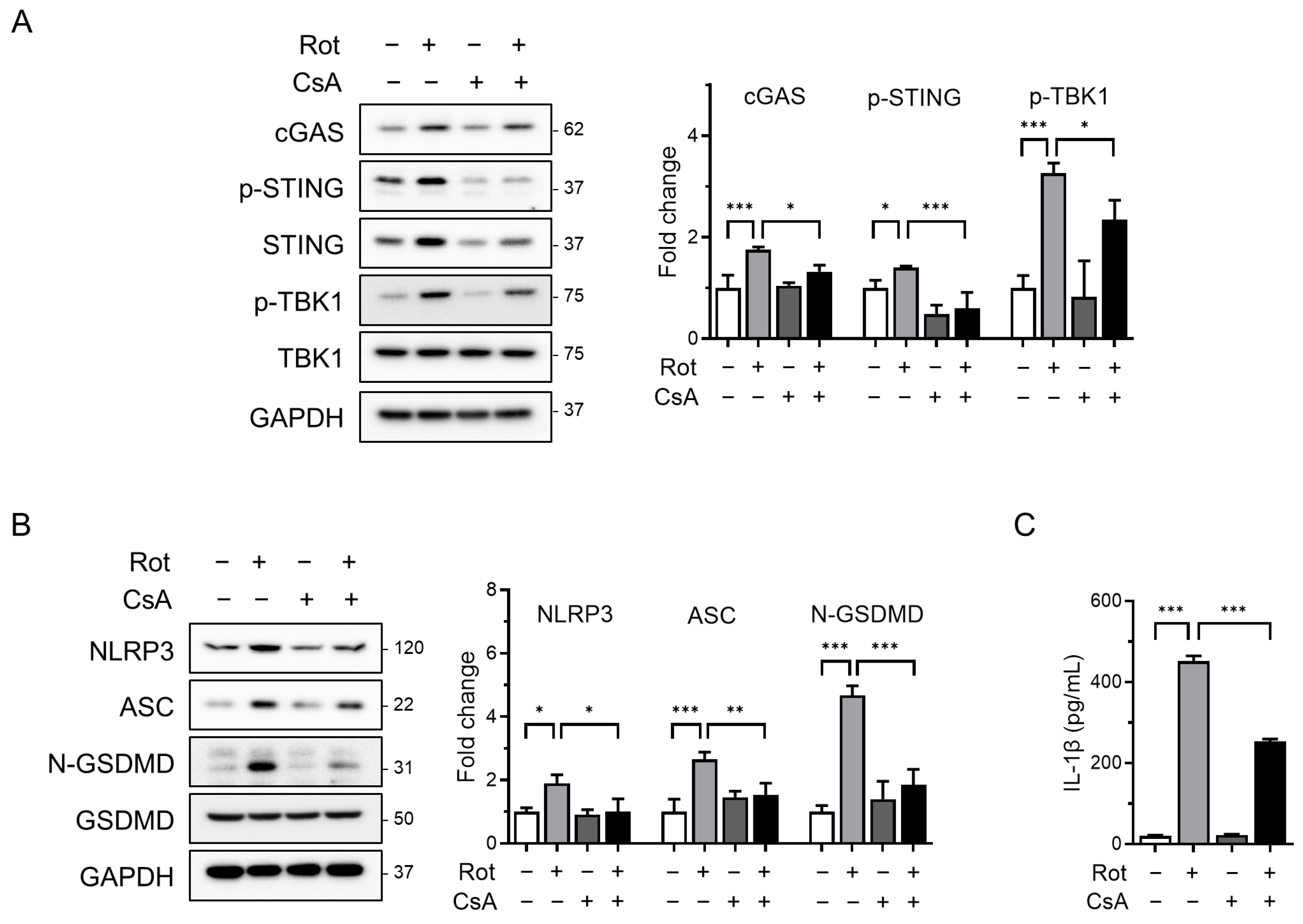 3.3. Mitochondrial ROS–mPTP Axis Promotes cGAS–STING-Mediated NLRP3 Inflammasome Activation
