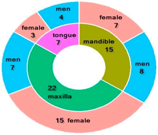 The study involved 64 individuals, including 39 women and 25 men. The study group consisted of 44 edentulous patients attending the Department of Prosthodontics at the Medical University of Bialystok for prosthetic rehabilitation, including 25 women and 19 men. These patients underwent surgery at the Department of Maxillofacial and Plastic Surgery of the University Clinical Hospital in Bialystok for squamous cell carcinoma of the oral cavity. Among them, 7 patients had surgery for tongue cancer, 22 for maxillary tumors, and 15 for mandibular tumors (Figure 1). The mean age of the subjects was 64.523 ± 3. Patients in the study group reported to the Prosthetics Department for prosthetic treatment at least 8 weeks after surgery.