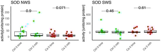 Enzymatic antioxidant activity in non-stimulated (NWS) and stimulated saliva (SWS) of cancer patients (red) and controls (green). Ca, cancer group; Ctrl, control group; SOD, superoxide dismutase.