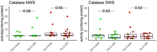 Enzymatic antioxidant activity in non-stimulated (NWS) and stimulated saliva (SWS) of cancer patients (red) and controls (green). Ca, cancer group; CAT, catalase; Ctrl, control group.