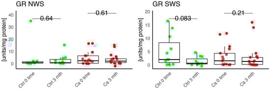 Enzymatic antioxidant activity in non-stimulated (NWS) and stimulated saliva (SWS) of cancer patients (red) and controls (green). Ca, cancer group; Ctrl, control group; GR, gluthation reductase.