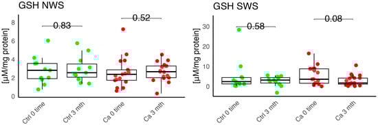 Enzymatic antioxidant in non-stimulated (NWS) and stimulated saliva (SWS) of cancer patients (red) and controls (green). Ca, cancer group; Ctrl, control group; GSH, reduced glutathione.