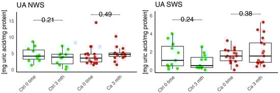 Enzymatic antioxidant concentration in non-stimulated (NWS) and stimulated saliva (SWS) of cancer patients (red) and controls (green). Ca, cancer group; Ctrl, control group; UA, uric acid.