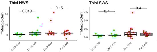Enzymatic antioxidant, thiols, concentration in non-stimulated (NWS) and stimulated saliva (SWS) of cancer patients (red) and controls (green). Ca, cancer group; Ctrl, control group.