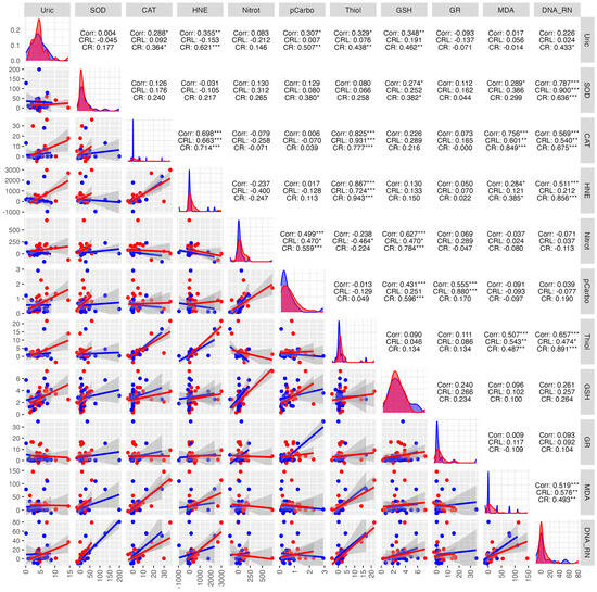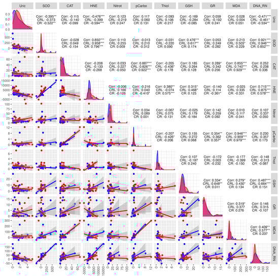 In the control group, positive correlations were observed between HNE and SOD (0.958 ***), DNA/RNA damage products and SOD (0.946 ***), MDA and protein carbonyls (0.909 ***), and DNA/RNA damage products and HNE (0.875 ***). A moderate negative correlation was found between: DNA/RNA and UA (−0.461 *), thiols and CAT (−0.436 *), thiols and protein carbonyls (−0.426 *) (Figure 14).