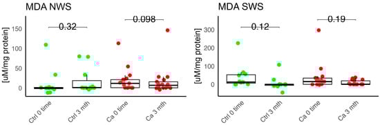 Oxidative damage product in non-stimulated (NWS) and stimulated saliva (SWS) of cancer (red) and control (green) group. Ca—cancer group, Ctrl—controls. MDA malondialdehyde.