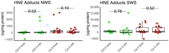 Oxidative damage product HNE Adduct in non-stimulated (NWS) and stimulated saliva (SWS) of cancer (red) and control (green) group. Ca—cancer group, Ctrl—controls.