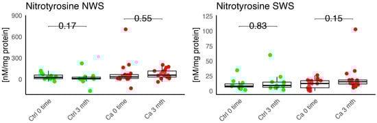 No statistically significant differences were observed in the levels of lipid peroxidation products (MDA, HNE), DNA/RNA damage products, or nitrotyrosine in either group (Figure 9, Figure 10, Figure 11 and Figure 12). However, the levels of protein oxidation product—protein carbonyls—were lower in the control group after three months of prosthesis use (p = 0.054; Figure 13).