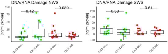 Oxidative damage product—DNA/RNA damage in non-stimulated (NWS) and stimulated saliva (SWS) saliva of cancer (red) and control (green) group. Ca—cancer group, Ctrl—controls.