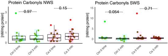 Carbonyl content was determined with Protein Carbonyl Content Assay Kit (MAK094; Sigma Aldrich, St. Louis, MO, USA). The method included the derivatization of protein carbonyl groups with 2,4-dinitrophenyl-hydrazine (DNPH) and the spectrophotometric detection of stable dinitrophenyl (DNP) hydrazone adducts at 375 nm.