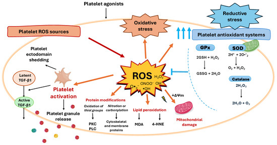 Multiple mechanisms have been proposed to explain the interplay between platelets and ROS in the pathophysiology of numerous diseases. Across diverse pathological conditions, impaired ROS homeostasis consistently associates with platelet hyperactivity, as described below.