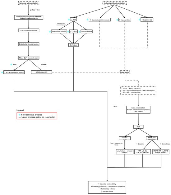 Schematic overview of lung ischemia–reperfusion injury. Ischemia with ventilation (left; mechanotransduction) and without ventilation (middle; oxygen debt) are shown with their respective pathways and links to reperfusion (right). Dashed boxes/lines indicate latent processes expressed on reperfusion; ❄ marks cold-sensitive processes. Reperfusion combines start-of-flow–induced NOX2 activation with O2-dependent bursts from succinate oxidation/reverse electron transport (RET) at complex I and from xanthine oxidase (XO). Reactive oxygen species (ROS) drive lipid peroxidation, protein nitration/carbonylation, and DNA breaks and activate NF-κB/AP-1, leading to cytokine/chemokine release, type II pneumocyte injury with ↓surfactant and alveolar collapse, increased vascular permeability, platelet/complement activation, pulmonary edema, and impaired gas exchange. AP-1, Activator Protein-1; ATP, adenosine triphosphate; CXCL1, CXC ligand 1; eNOS, endothelial nitric oxide synthase, GM-CSF, Granulocyte-macrophage colony-stimulating factor; IL, interleukin; KATP, ATP-sensitive potassium channel; MCP-1, Monocyte chemoattractant protein-1; MIP, Macrophage inflammatory protein; NADPH, nicotinamide adenine dinucleotide phosphate; NF-κB, nuclear factor kappa-B; NO, nitric oxide; NOX2, NADPH oxidase-2; PECAM-1, platelet endothelial cell adhesion molecule-1; PI3K–Akt, Phosphoinositide 3-kinase → Akt pathway; RANTES, “Regulated on Activation, Normal T-cell Expressed and Secreted”; ROS, reactive oxygen species; SDH, succinate dehydrogenase; TNF, tumor necrosis factor; VE-cadherin, vascular endothelial cadherin; VEGFR2, vascular endothelial growth factor receptor-2; XO, xanthine oxidase.