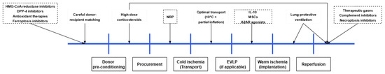Due to the fact that LIRI involves a complex cascade with multiple overlapping pathways, a multi-faceted approach is necessary. Strategies include modifying surgical and perfusion techniques (to minimize ischemic time and reperfusion shocks), non-pharmacologic interventions (ventilatory strategies, extracorporeal support, positioning, conditioning), and pharmacologic or cellular therapies (antioxidants, anti-inflammatories, etc.). Below are some of the possible treatment strategies that have been proposed. The origin of the data regarding these treatment strategies vary from small-animal and large-animal models to EVLP studies using human donor lungs and clinical data (observational cohorts and randomized trials). Table 1 shows the mechanisms, evidence classes, net signals and translational status for each intervention category. Figure 2 shows a timeline overview of the different treatment modalities for LIRI, both established and experimental.