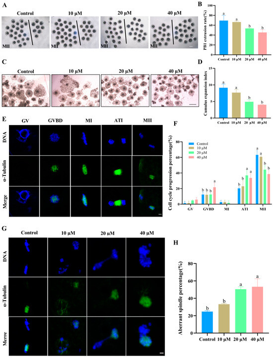 (A) The first polar body (PB1) expulsion of oocytes from the control group and ACE-treated groups (10, 20, and 40 μM). Oocytes to the left of the black line have successfully extruded PB1, whereas those to the right have not. Scale bar = 100 μm. (B) Effect of different ACE concentrations on the PB1 extrusion rate of porcine oocytes. n = 90. (C) Cumulus expansion of COCs from the control group and ACE-treated groups. Scale bar = 500 μm. (D) Effects of different ACE concentrations on the cumulus expansion index of COCs. n = 90. (E) Normal spindle morphology of oocytes at various meiotic stages. Scale bar = 10 μm. Green: α-tubulin, blue: chromosome. Stages: GV (germinal vesicle), GVBD (germinal vesicle breakdown), MI (metaphase I), ATI (anaphase-telophase I), and MII (metaphase II). (F) Proportion of oocytes arrested at different meiotic stages following treatment with different ACE concentrations. n = 90. (G) Representative images of spindle morphology and chromosome alignment in oocytes treated with different ACE concentrations. Scale bar = 10 μm. (H) Percentage of oocytes with aberrant spindles in groups treated with different ACE concentrations. n = 90. The letter “n” indicates the total number of oocytes in each group of three independent replicates. a,b Values with different superscripts indicate statistical significance (p < 0.05).