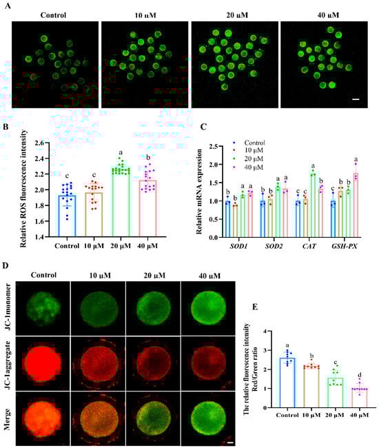 As shown in Figure 2A,B, the fluorescence intensity of ROS in oocytes was significantly increased in the 20 and 40 μM ACE-treated groups compared with the control group (p < 0.05). Moreover, the relative mRNA levels of antioxidant enzymes, including SOD1, SOD2, CAT, and GSH-px, were upregulated in the oocytes after 20 and 40 μM ACE exposure (Figure 2C, p < 0.05). Furthermore, the results presented in Figure 2D,E show that the MMP levels, as indicated by the red/green fluorescence intensity ratio, decreased in a dose-dependent manner in the oocytes following ACE exposure (p < 0.05). These results suggest that ACE exposure induces oxidative stress and mitochondrial damage in oocytes.