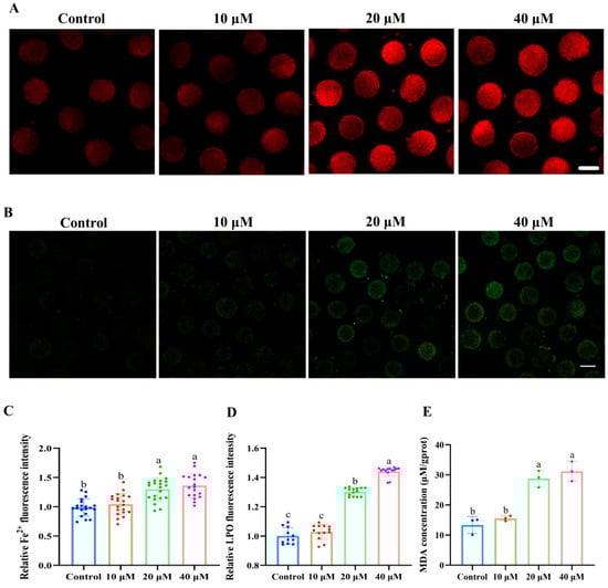 Figure 3A,C show that the fluorescence intensity of Fe2+ in 20 and 40 μM ACE-treated oocytes was significantly higher than that in the control group (p < 0.05). Meanwhile, the accumulation of LPO and MDA was also increased in 20 and 40 μM ACE-treated oocytes (Figure 3B,D,E, p < 0.05). These results suggest that ACE exposure leads to excessive iron accumulation and enhanced lipid peroxidation in porcine oocytes. According to the results above, a concentration of 20 μM ACE was selected for subsequent experiments.