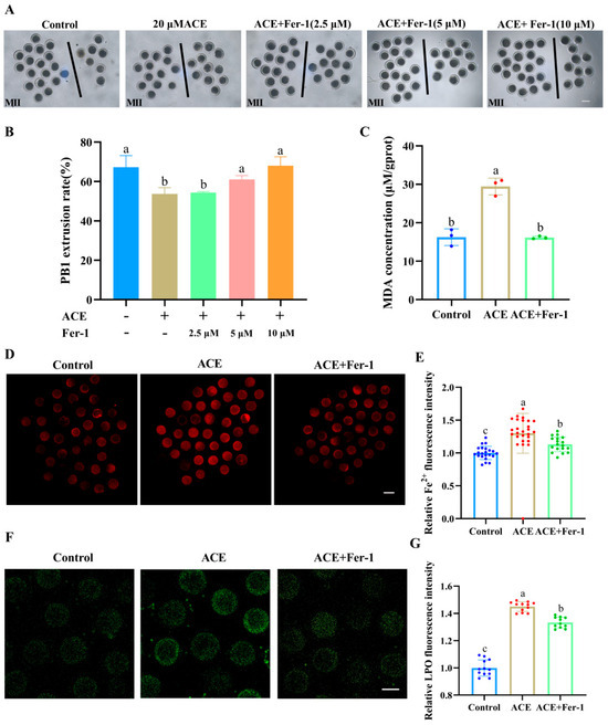 (A) The first polar body (PB1) extrusion of oocytes from control, ACE-treated (20 μM), and Fer-1 co-treated (2.5, 5, and 10 μM) groups. Scale bar = 100 μm. (B) Effects of Fer-1 co-treatment (2.5, 5, and 10 μM) on PB1 extrusion rate in ACE-exposed (20 μM) oocytes. n = 75. (C) Malondialdehyde (MDA) concentration in oocytes from control, 20 μM ACE-treated, and ACE + 5 μM Fer-1 co-treated groups. n = 1050. (D) Representative images of Fe2+ fluorescence intensity in oocytes from control, 20 μM ACE-treated, and ACE + 5 μM Fer-1 co-treated groups. Scale Bar = 100 μm. (E) Relative Fe2+ fluorescence intensity in oocytes from control, 20 μM ACE-treated, and ACE + 5 μM Fer-1 co-treated groups. n = 60. (F) Representative images of LPO fluorescence intensity in oocytes from control, 20 μM ACE-treated, and ACE + 5 μM Fer-1 co-treated groups. Scale Bar = 100 μm. (G) Relative LPO fluorescence intensity in oocytes from control, 20 μM ACE-treated, and ACE + 5 μM Fer-1 co-treated groups. n = 30. a–c Values with different superscripts indicate statistical significance (p < 0.05).
