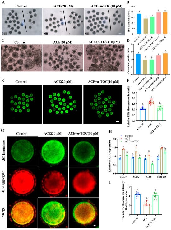 (A) Representative images of the first polar body (PB1) extrusion of oocytes from the control group, 20 μM ACE, and ACE + 10 μM α-TOC co-treated groups. Scale bar = 100 μm. (B) Effects of different concentrations of α-TOC (5, 10, and 20 μM) on the PB1 extrusion rate of ACE-exposed (20 μM) oocytes. n = 75. (C) Cumulus expansion of cumulus oocyte complexes (COCs) from the control, 20 μM ACE, and ACE + 10 μM α-TOC co-treated groups. Scale bar = 500 μm. (D) Effects of different concentrations of α-TOC (5, 10, and 20 μM) on the cumulus expansion index of ACE-exposed (20 μM) COCs. (E) Representative images of ROS staining in oocytes from control, 20 μM ACE-treated, and ACE + 10 μM α-TOC co-treated groups. Scale bar = 100 μm. (F) Relative fluorescence intensities of ROS signals in oocytes from control, 20 μM ACE-treated, and ACE + 10 μM α-TOC co-treated groups. n = 60. (G) Representative images of JC-1 staining in oocytes from control, 20 μM ACE-treated, and ACE + 10 μM α-TOC co-treated groups. Scale bar = 10 μm. (H) Effect of α-TOC on the mRNA expression levels of antioxidant-related genes in ACE-exposed oocytes. n = 300. (I) Relative average fluorescence intensities of JC-1 red/green signals in oocytes from control, 20 μM ACE-treated, and ACE + 10 μM α-TOC groups. n = 30. a–c Values with different superscripts indicate statistical significance (p < 0.05).