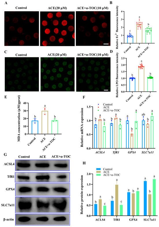 (A) Representative images of Fe2+ fluorescence intensity in oocytes from control, 20 μM ACE-treated, and ACE + 10 μM α-TOC co-treated groups. Scale Bar = 100 μm. (B) Relative Fe2+ fluorescence intensity in oocytes from control, 20 μM ACE-treated, and ACE + 10 μM α-TOC co-treated groups. n = 60. (C) Representative images of LPO fluorescence intensity in oocytes from control, 20 μM ACE-treated, and ACE + 10 μM α-TOC co-treated groups. Scale Bar = 100 μm. (D) Relative LPO fluorescence intensity in oocytes from control, 20 μM ACE-treated, and ACE + 10 μM α-TOC co-treated groups. n = 60. (E) MDA concentration in oocytes from control, 20 μM ACE-treated, and ACE + 10 μM α-TOC co-treated groups. n = 1050. (F) Relative mRNA expression levels of ferroptosis-related genes in oocytes from the control, 20 μM ACE-treated, ACE + 10 μM α-TOC co-treated groups. n = 300. (G,H) Expression of ferroptosis-related proteins in oocytes from the control, 20 μM ACE-treated, and ACE + 10 μM α-TOC co-treated groups. n = 450. a–c Values with different superscripts indicate statistical significance (p < 0.05).