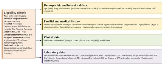 Medical records and the computer data system of the hospital, “Atlas Med” were the source of our data. Patients were selected using a filter based on the primary diagnosis at discharge (ICD-I69.3). Subsequently, from the patients’ follow-up sheets, we obtained data on hereditary collateral history (HCA), medical history, consumption of toxic substances, clinical examination, and laboratory tests. Biomarkers were measured at the time of admission to the hospital following the same protocol. The eligible patients were those admitted for neurological rehabilitation after an ischemic stroke, so, the timing from the acute event to the admission varied depending on the patient’s functional prognosis and transfer logistics. Information on the presence of comorbidities (e.g., hypertension, diabetes, dyslipidemia, chronic kidney disease) was collected from the medical charts; diagnoses were established based on clinical records and laboratory criteria as described above. Information regarding chronic medication use, including statin therapy, was inconsistently reported in hospital charts and, therefore, not included in the present analysis.