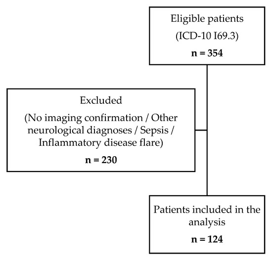 Patients were selected based on the diagnosis of ischemic stroke (ICD 10-I69.3—Sequelae of cerebral infarction). Although no formal local validation has been conducted in Romania, international studies have reported good accuracy for this code, with positive predictive values generally above 80% and sensitivity reaching over 90% when used as the principal diagnosis [24,25]. All cases were documented with neurologic examination, using National Institutes of Health Stroke Scale (NIHSS ≥ 0), assessed at the time of hospital admission, recorded by the attending neurologist [26], and imagistic criteria (native or angio-cranial Computer Tomography—ruling out hemorrhage or tumors) [27]. Patients hospitalized for other neurological pathologies, without a diagnosis of ischemic stroke documented by imaging, septic, or with any known inflammatory disease in acute flare-up, were excluded. Patient’s neurological and functional status at the time of transfer to the rehabilitation department, corresponding to the subacute phase after ischemic stroke, was evaluated by NIHSS score.