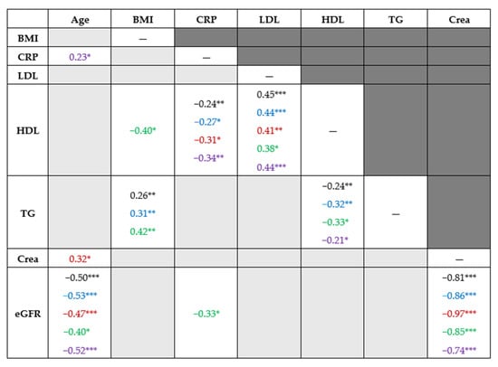 Bivariate association of quantitative factors. Note. * p-value < 0.05, ** p-value < 0.01, *** p-value < 0.001. Light gray background indicates the absence of statistically significant correlations. The reported values represent Spearman’s rank correlation coefficients. Blue indicates the values for men, red for women, green for patients with minor disability and violet for patients with at least a moderate disability. BMI—body mass index; CRP—C-reactive protein, LDL—low-density lipoprotein cholesterol, HDL—high-density lipoprotein cholesterol, TG—triglycerides, CRE—creatinine, eGFR—estimated glomerular filtration rate.