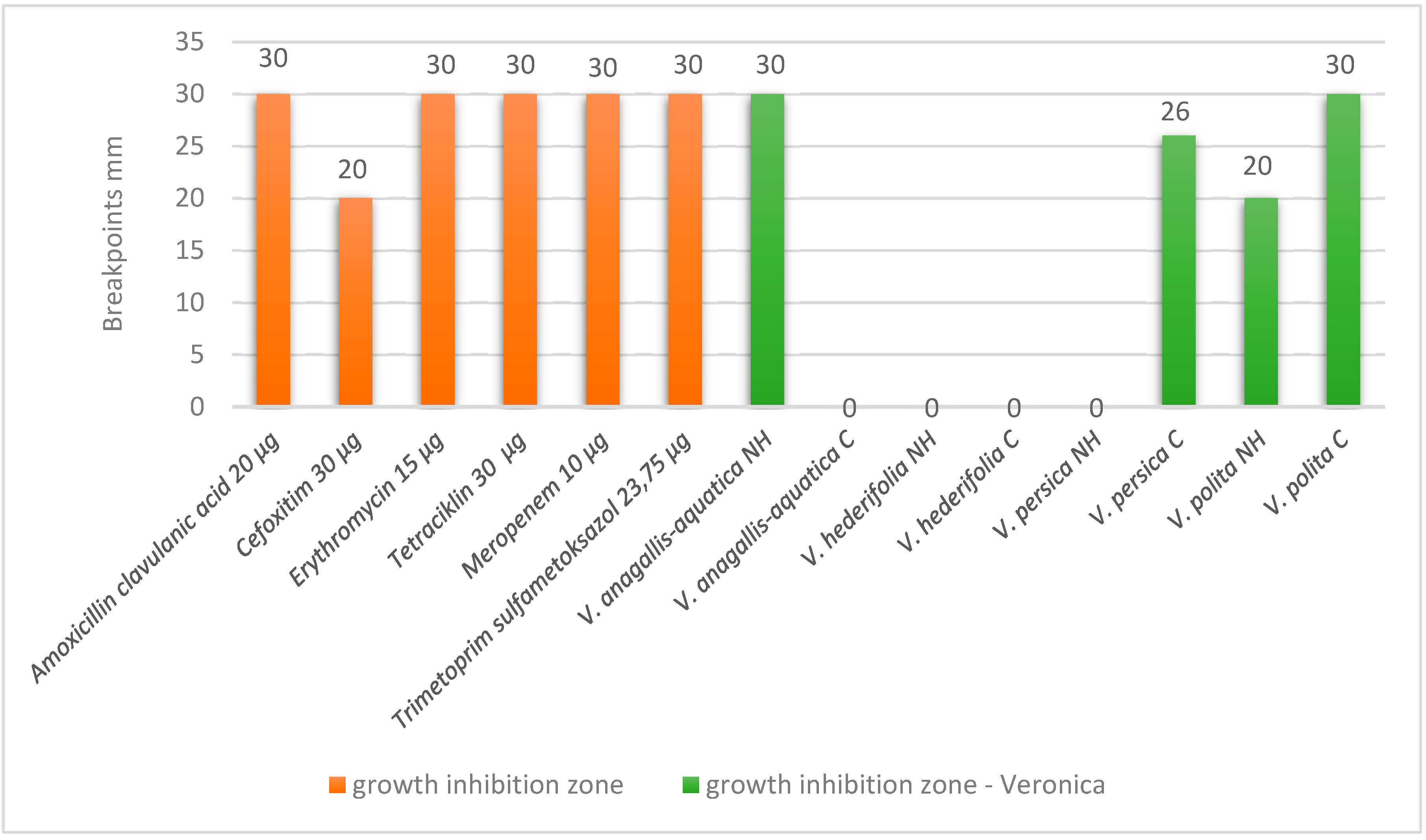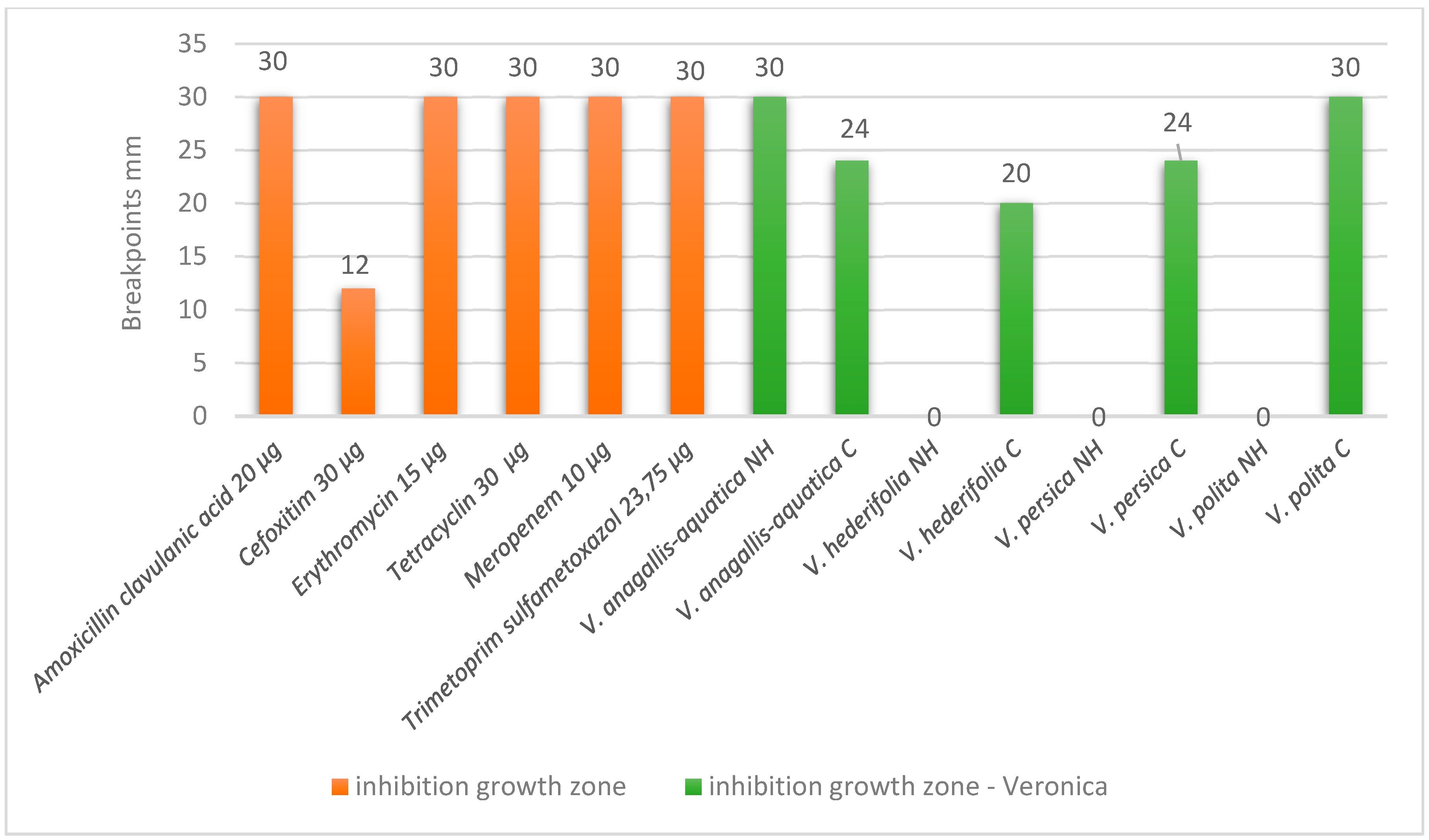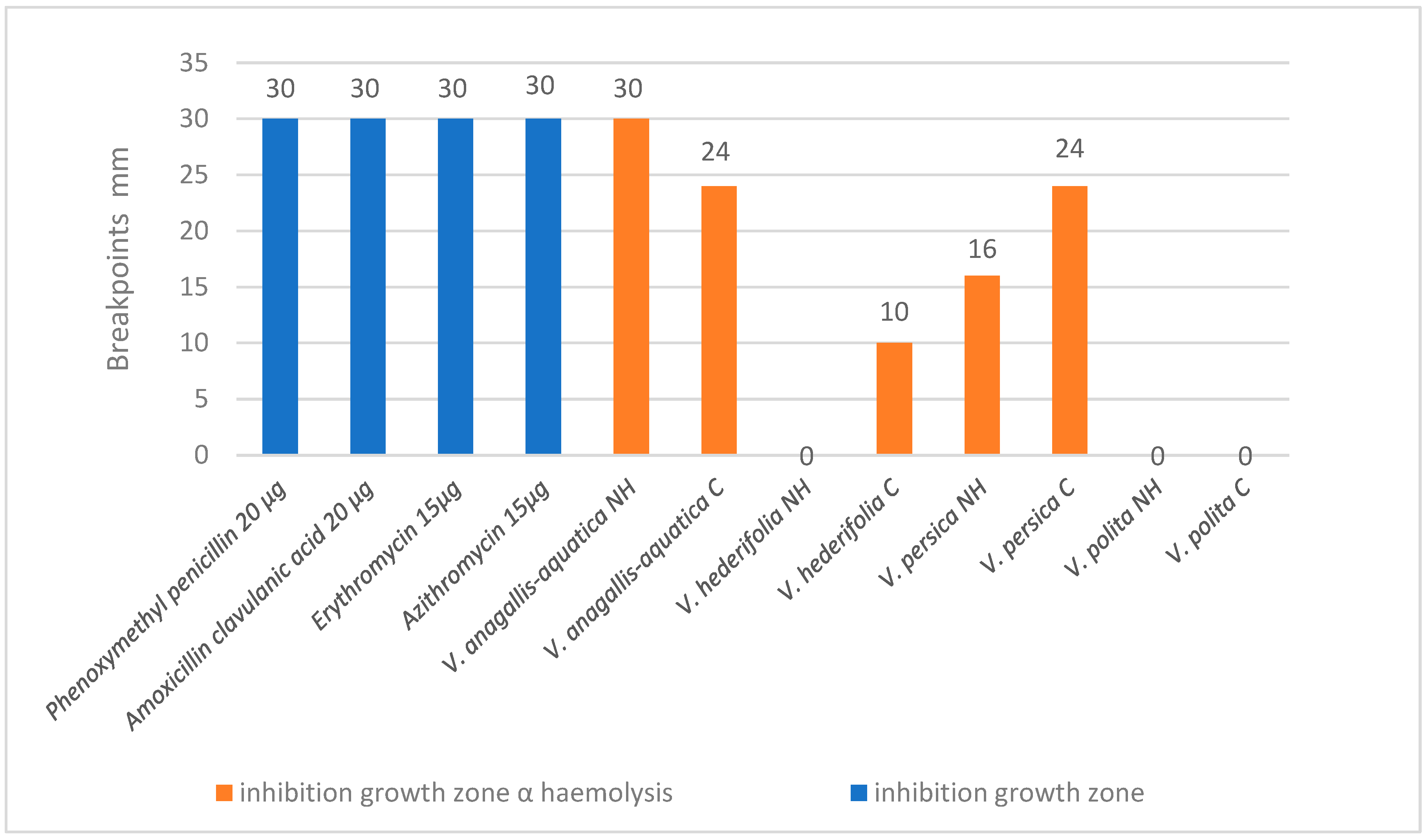 Eight samples were tested for antibacterial activity: V. anagallis-aquatica, V. hederifolia, V. persica and V. polita from their natural habitat (NH) and from cultivation (C). Ethanol phenolic extracts were tested on eight bacterial species obtained from the ATCC (mainly Gram-positive since the previous tests have shown activity on Gram-positive bacteria). Methods of disk diffusion and diffusion performed by agar drilling have been used. At the same time, ATCC species of bacteria have been tested in accordance with EUCAST [20] so that the antibacterial activities can be compared (Tables S2–S9).