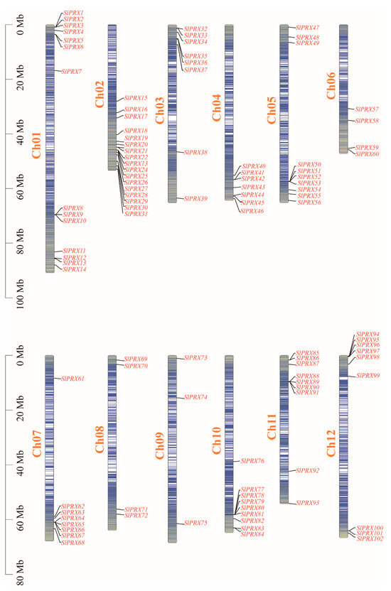 The 102 SlPRX genes were located on twelve tomato chromosomes (Figure 1). Chromosome Ch02 contained the maximum number (17) of SlPRX genes, and Ch09 contained the minimum number (3). A total of 34 SlPRX genes were distributed in the 0–20 Mb region of 12 chromosomes, and 58 genes were distributed in the 40–80 Mb region. Only four SlPRX genes (SlPRX11 to SlPRX14) were located at the lower end, within a region between 80 and 100 Mb of chromosome Ch01, longer than the other chromosomes, and six SlPRX genes (SlPRX15 to SlPRX18, SlPRX 57, and SlPRX58) were distributed within a region between 20 and 40 Mb (Figure 1).