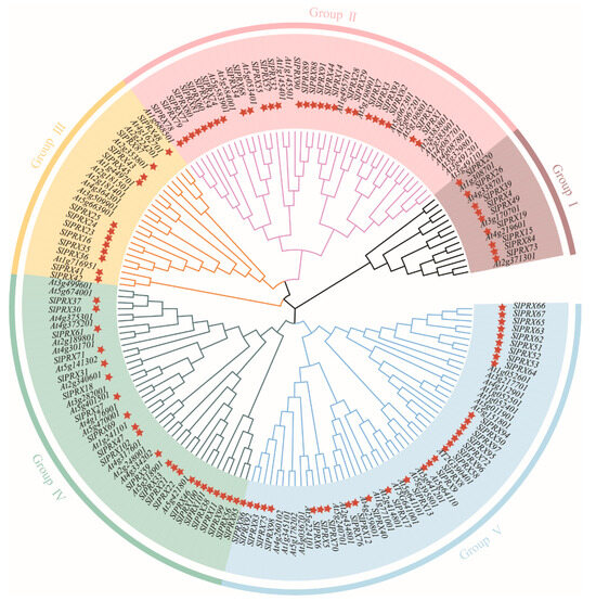 Phylogenetic analysis of class III peroxidase proteins from tomato and Arabidopsis. An unrooted phylogenetic tree was constructed using the neighbor-joining method in MEGA 11, based on the full-length amino acid sequences of PRX proteins from tomato (Sl) and Arabidopsis (At). Bootstrap values from 1000 replicates are shown at the branches to indicate confidence levels. The red stars represent members of the SlPRX gene family from tomato.