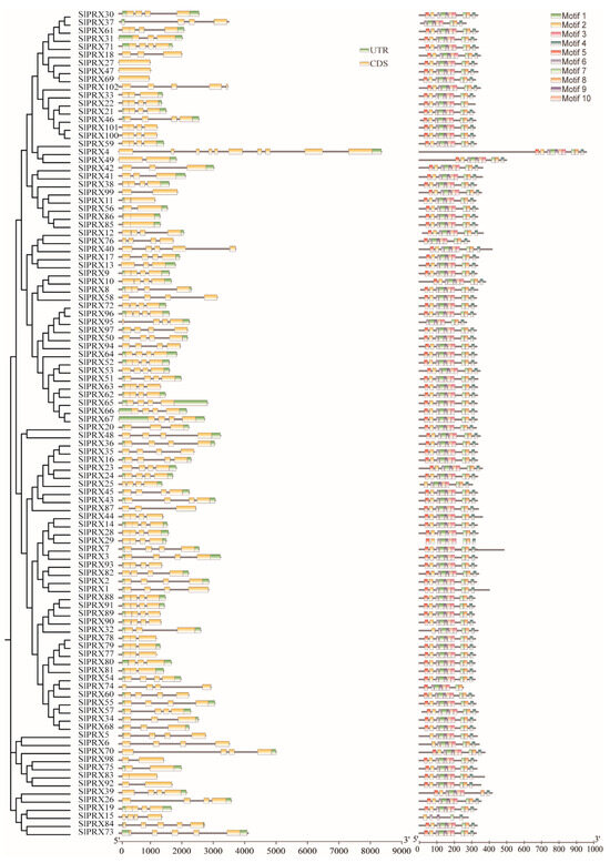 The gene structures and conserved motifs of SlPRX genes. The phylogenetic tree in the left was constructed based on the full-length sequences of SlPRX proteins. The exon–intron structure of the SlPRX genes and the conserved motifs of SlPRX proteins were visualized using TBtools software (version 2.310). Untranslated regions (UTRs), coding sequences (CDS), and introns are represented by green boxes, yellow boxes, and black lines, respectively. Distribution of the ten conserved motifs (1–10) was identified by using the MEME database, with each motif represented by a colored box.