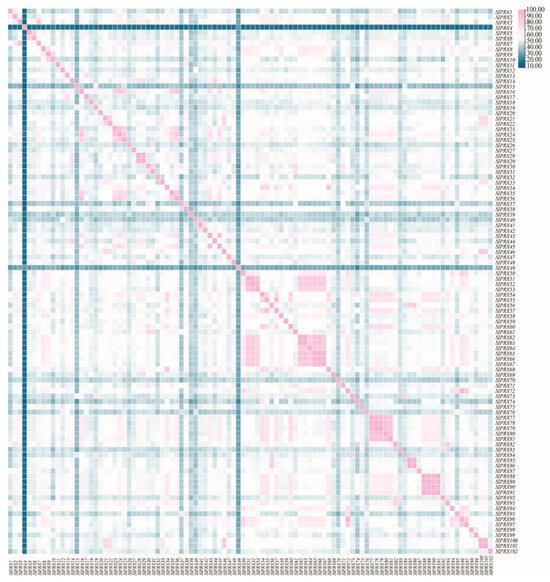 Sequence similarity and correlation between SlPRX proteins. A hierarchical cluster analysis was performed based on the pairwise correlation coefficients of SlPRX protein sequences. The heatmap color scale from blue (high correlation) to pink (low correlation) illustrates the degree of sequence similarity between the different SlPRX proteins.